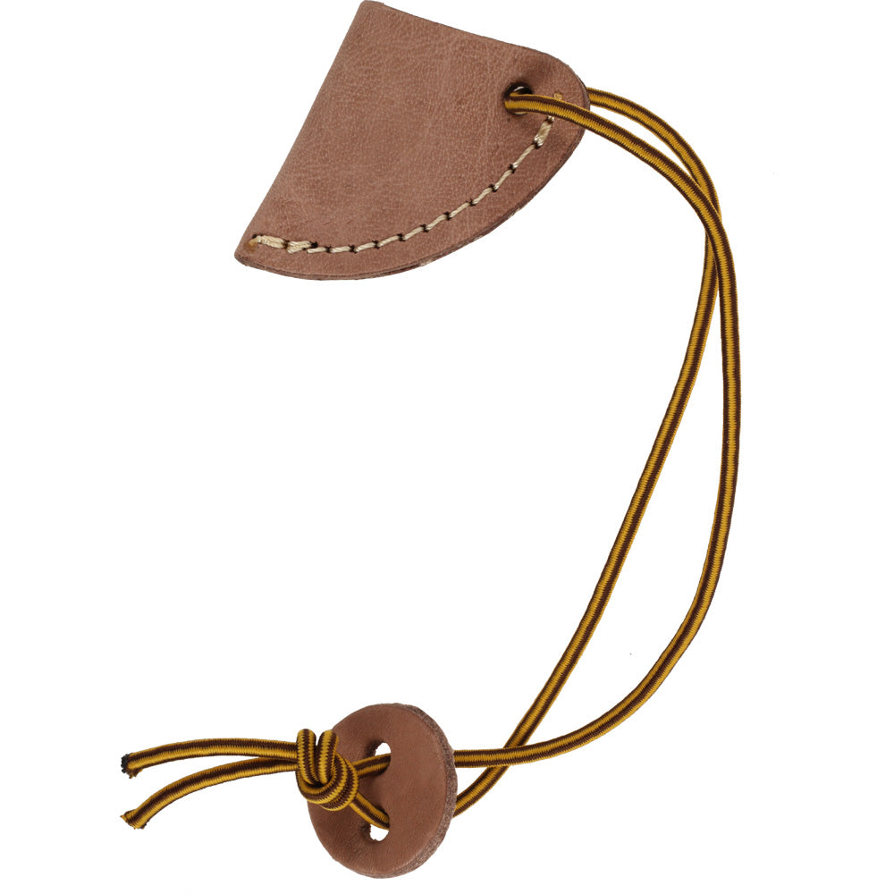 - Usage: You can put the round leather patch through the upper string ear. The upper string ear is bigger than the lower one. This creates the hold. You can put the cap on the upper tip. The other side of the string can be left in the notch.